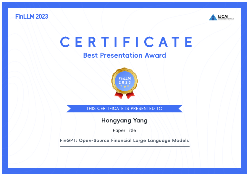 First official FinGPT paper, presented at the FinLLM Workshop @ IJCAI 2023 (August 2023).